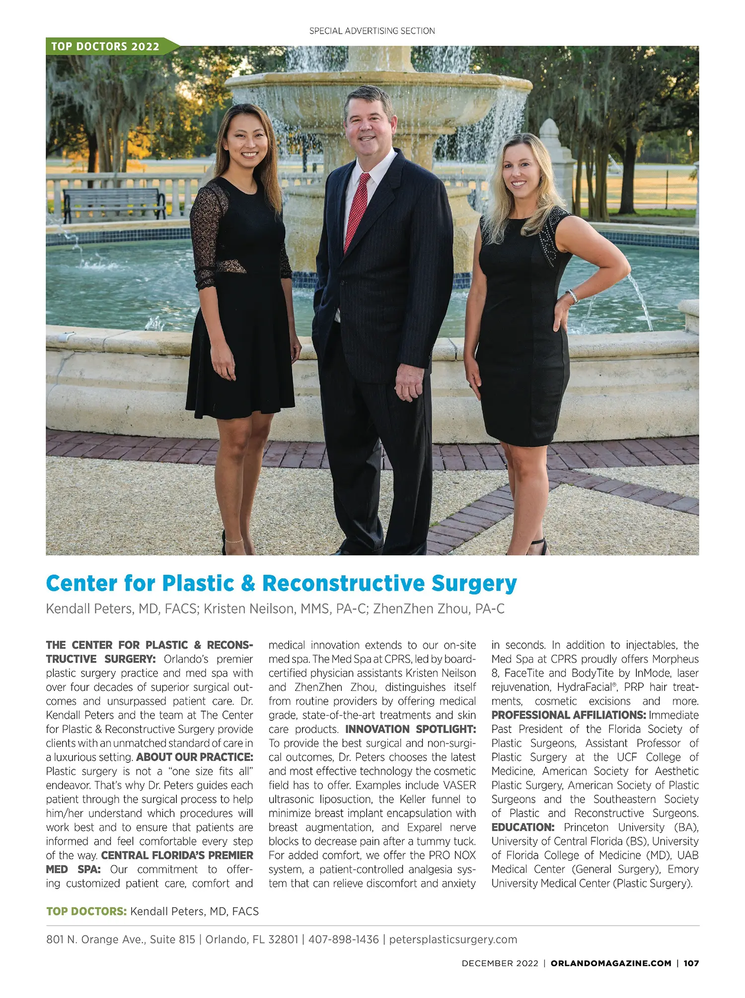 At the Center for Plastic and Reconstructive Surgery, we are proud to be leaders in the plastic surgery field and take pride in satisfying the lives of our patients. To learn more about Dr. Peters and see his feature in Orlando Magazine, please CLICK HERE.